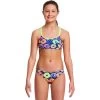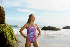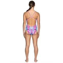 The AMANZI® Gypsy Tribe Girls Proback One Piece Swimsuit is white and features a kaleidoscopic pattern in various shades of pink, purple and blue.  Thin pink, white and purple straps come together in the back to create a comfortable, open back design.  This swimsuit is also quick drying so it is the perfect suit for competitive swimmers.  Be the center of attention in this comfortable swimsuit.