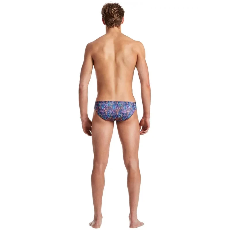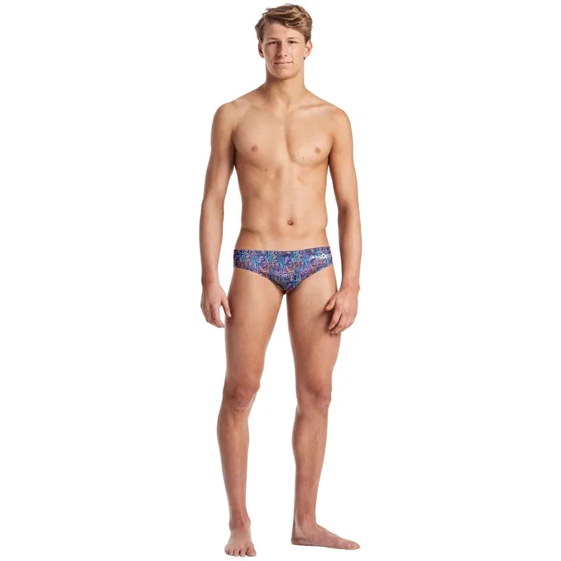 Love grunge but like a splash of colour too? You are going to fall head over swim fins for the AMANZI Iron Duke Briefs! This bold iron and resin style print features jet black geometrics overlaid on vibrant shades of ruby, tangerine, shamrock, violet, and emerald.
