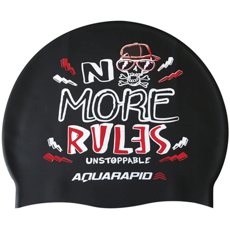 Pool and swimming cap by Aquarapid, made in silicone, with “NO MORE RULES” print, designed for those who make swimming their passion and lifestyle.