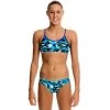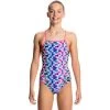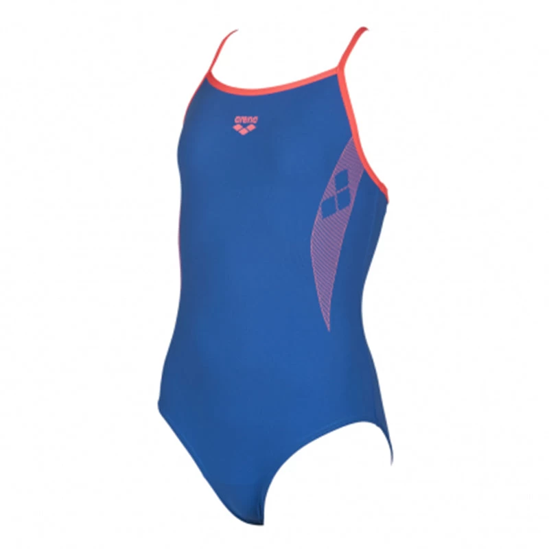 The Demetra girls swimsuit features a light drop back which is feminine whilst still maintaining an athletic look! It has green patterning down each flank and the green extends in to the slim straps. The Demetra is also available in blue with pink straps.