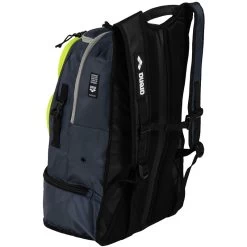 This bag has a 40 litre capacity, measuring 55 x 40 x 30 cm. The breathable inner compartments keep moisture under control. Fit gear like kickboards in the spacious back section, and up to two pairs of shoes in the bottom compartment. The shoulder straps are padded for comfort and have a front chest buckle for extra stability. The side pockets keep water bottles and other essentials accessible. Hang inside a locker with the karabiner hook.