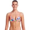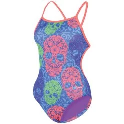 The Dolfin Bellas Sugar Skull Womens Cross Back One Piece Swimsuit features a two tone blue background with a pink, green and purple skull pattern. Thin pink straps come together in the back to form a cross back design to allow for full range of movement and maximum comfort. Swim with confidence in this comfortable swimsuit.