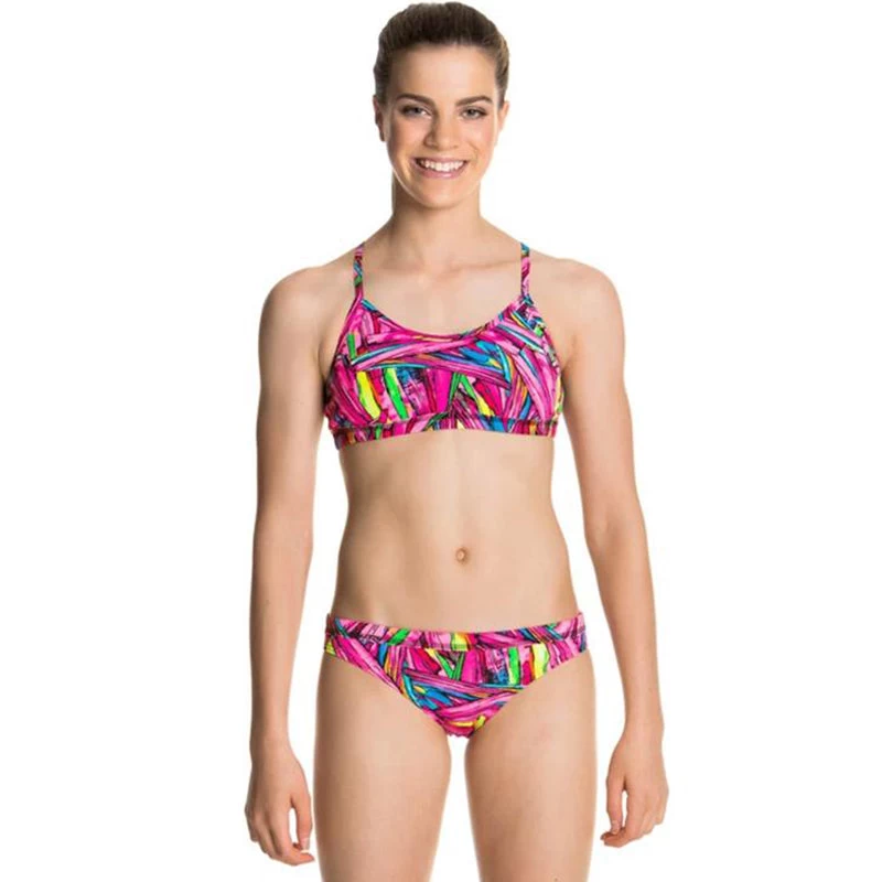 A firm fitting crop top and hipster brief suited to the sporty girl. Its a secure fit with underbust and waist elastic and drawcord in the brief. Features a single shoulder bind strap finish. Available in sizes 8 – 14.