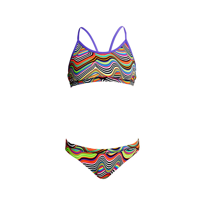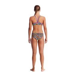 A firm fitting crop top and hipster brief suited to the sporty girl. Its a secure fit with underbust and waist elastic and drawcord in the brief. Features a single shoulder bind strap finish.