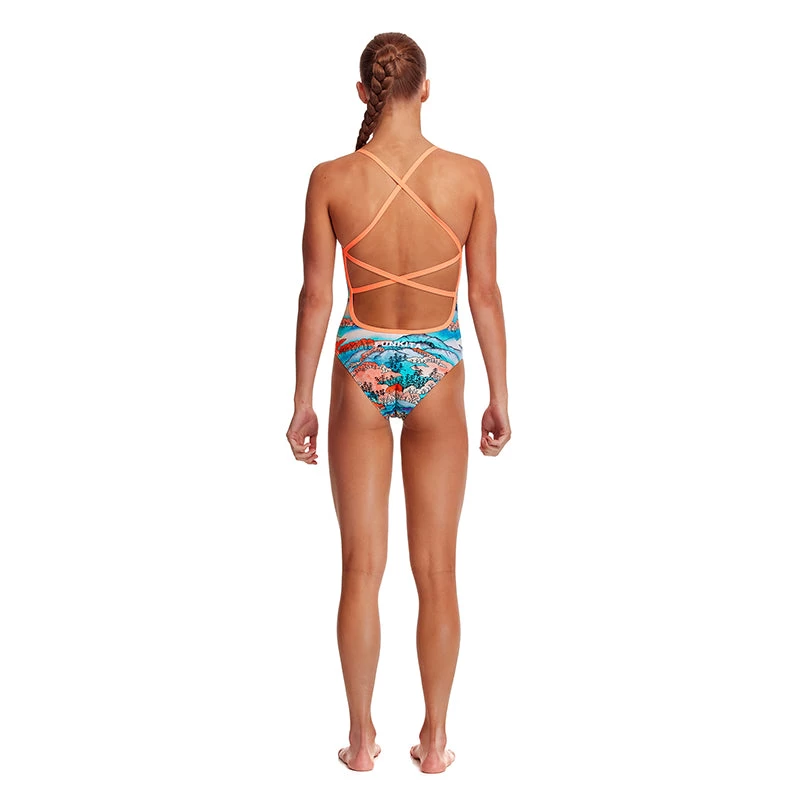 You’ll be sure to get noticed on pool deck in our strappiest one piece yet! Single strap binds that criss cross down your back with a moderately high cut leg.
