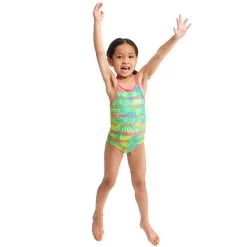 I’m the most popular Funkita one piece for little swimmers offering a full back and low leg for complete coverage.