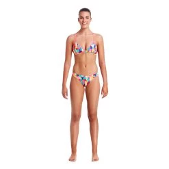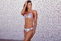 A fun triangular bikini top with adjustable single straps, crossing over at the back. Features a triangle shaped cup area with a single strap bind and narrow underbust elastic, suitable for A-C cups. Sold as separates and available in sizes 8 – 14.