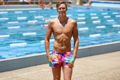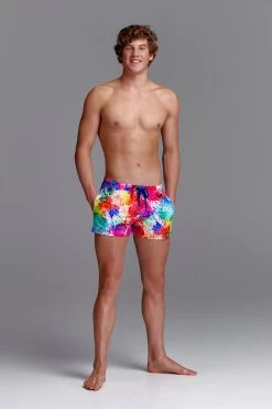 Short and stylish fitted watershort made of quick drying polyester. Features a built-in brief for added support, deep side pockets, coin pocket and drawcord to fasten. Now with Funky Trunks branded brass hardware including metal tips, eyelets and rivets. Funky Trunks patch on leg. Inseam length is 8.5cm. 90% Polyester 10% Elastane.