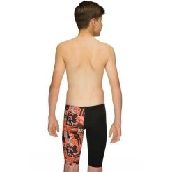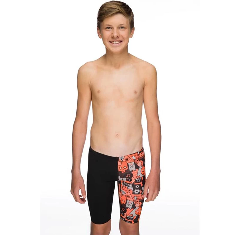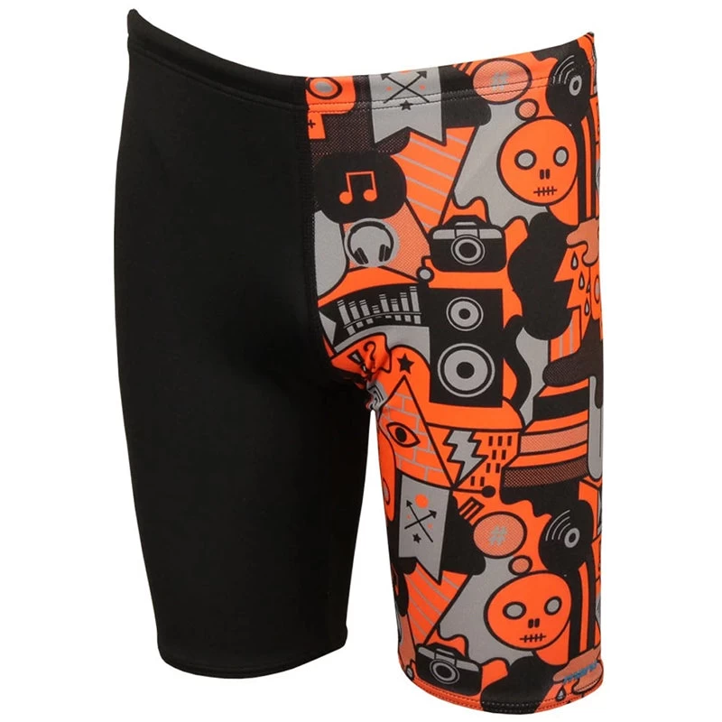 The Maru Lookout Boys Pacer Jammers feature a solid black right leg and an orange, grey and black music inspired patterned left leg. These jammers offer comfortable leg openings, are quick drying and hold their shape. Active swimmers will enjoy the all-around comfort of these jammers.