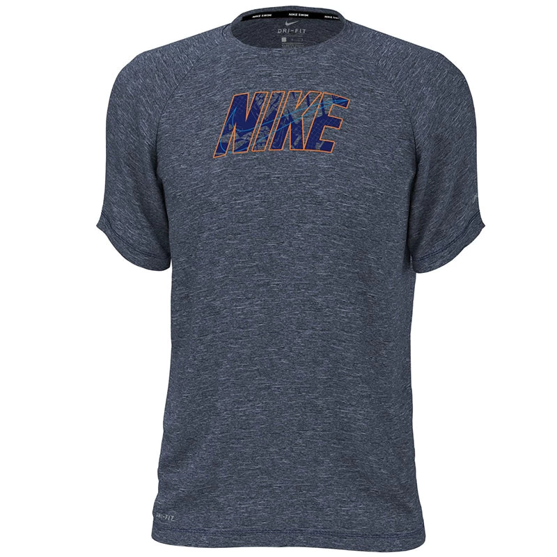 Enjoy outdoor water activities safely in the Men’s Nike Swim Collage Logo Short Sleeve Hydroguard. The sleek men’s swim shirt offers UV protection to help block the sun’s damaging rays from penetrating through the material. Dri-FIT technology helps to keep you comfortable and dry before and after you hit the water, while the interior neck tape helps to minimize chafing. (NESSC661)