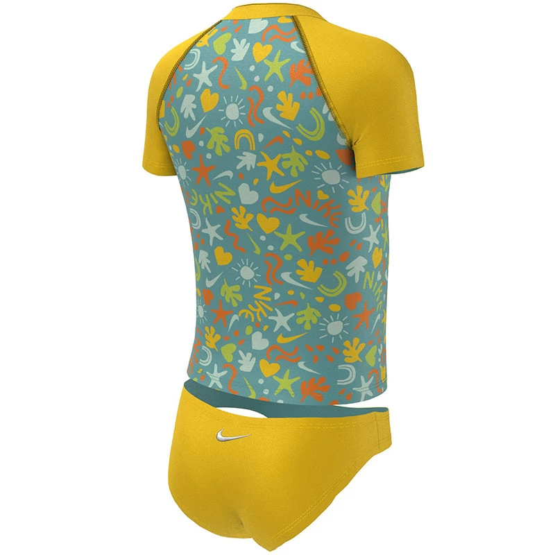 The Girls’ Nike Swim Fun Forest Short Sleeve Top Bikini Set has an ergonomic enhanced fit that’s designed for young athletes. The short sleeves offer extra protection from the sun while the standard bottom coverage allows her to enjoy her favorite water activities in comfort. The top of this girls’ two-piece suit features a fun print with an embroidered swoosh on the bottoms for a fashionable finishing touch. (NESSC775)
