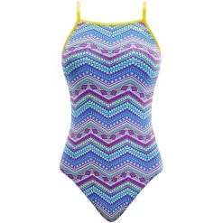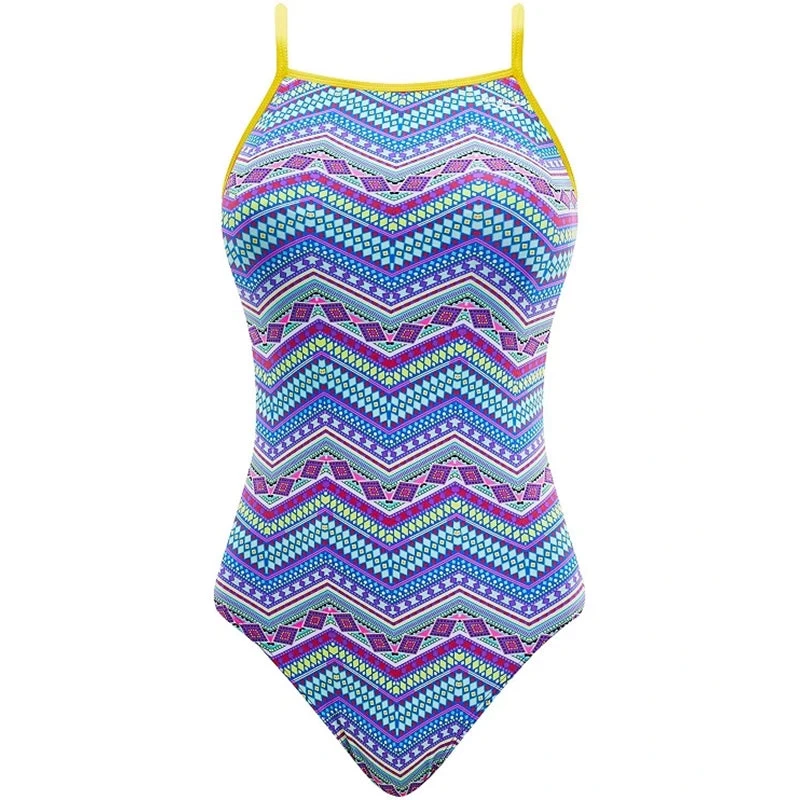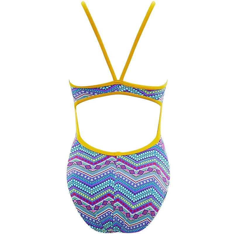 The Tribe Vibe Funnies Flutter Back Swimsuit utilizes a sleek Poly/Spandex fabrication to provide performance in and out of the water.